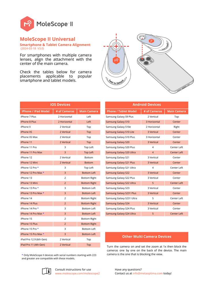 Universal attachment adheres to your smartphone device and connects MoleScope II to most popular smartphone and tablet models. Align this attachment to the center of the main camera of your device then attach your MoleScope or TrikoScope device. This reusable, adhesive attachment includes a cap to cover when not in use.